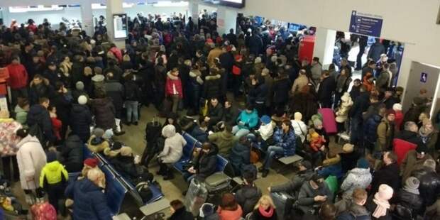 Слушатель радиостанции "Говорит Москва" предоставил фото толпы, которая образовалась в аэропорту Калининграда после суточной приостановки работы.