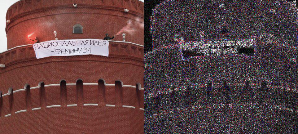 После появления в сети фотографий активисток с плакатом "Национальная идея — феминизм" на Угловой Арсенальной башне Кремля некоторые интернет-пользователи заметили несостыковки. Существовало всего две фотографии девушек с плакатом, не было снимков и видеозаписи от туристов и прохожих, не было видеозаписи и от самих организаторов, хотя это был один из самых заметных эпизодов акции.