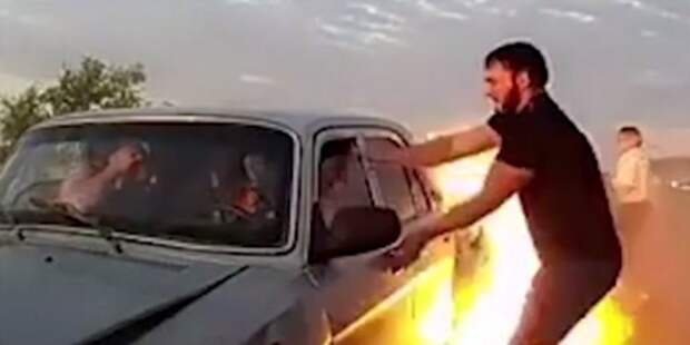 Телеканал "РЕН ТВ" опубликовал видео, на котором водители на трассе в Ингушетии спасли людей из горящего автомобиля.