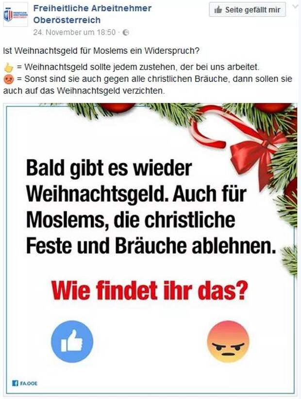 Профсоюз, связанный с ультраправой "Австрийской партией свободы", на своей странице в Facebook запустил опрос на тему того, должны ли мусульмане, отрицающие христианские праздники и традиции, получать бонусы к Рождеству.