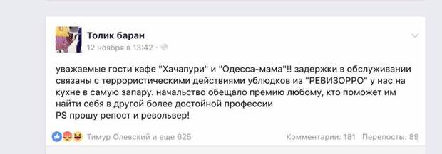 Официальный символ ресторана "Толик-баран" в день посещения заведения журналистами опубликовал запись, в которой объяснил задержки в работе "террористическими действиями ублюдков из "Ревизорро".