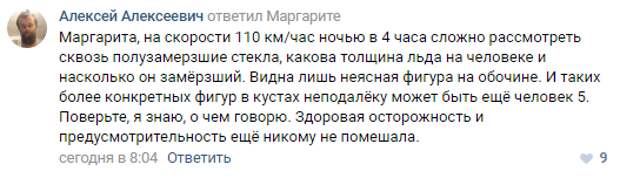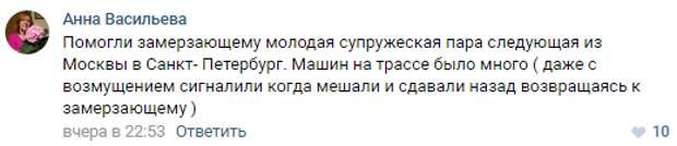 "Удивляюсь равнодушию водителей и пассажиров проезжавших [...] по трассе М-10 ( Москва- Санкт-Петербург) в районе г. Торжка , высвечивая фарами фигуру человека стоящего на коленях на обочине в 40 градусный мороз, ни кто не остановился... Молодой мужчина (вовсе не бомж) из последних сил взывал о помощи, на его руках сжатых в кулак был слой льда, ноги не разгибались. Хочется призвать людей быть не равнодушными к чужому горю. Беда может случится с каждым", - написали в соцсети.