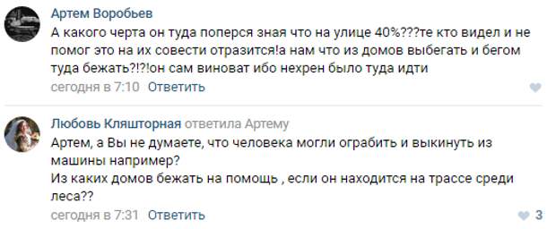 Одна из комментаторов поста по имени Анна уточнила, что замерзавшего мужчину спасла молодая супружеская пара, вызвав этим возмущение у других участников движения.