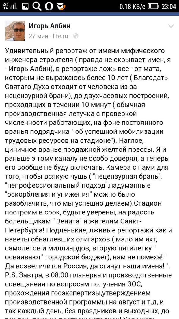 Бывший генподрядчик "Зенит-Арены" упрекал Албина в срыве сроков строительства стадиона и невыплате 1 млрд руб. за выполненные работы. В свою очередь, Албин заявил, что генподрядчик не отработал ранее выплаченные деньги и срывает сроки ввода в эксплуатацию. Во всем этом предстоит разобраться судам.
